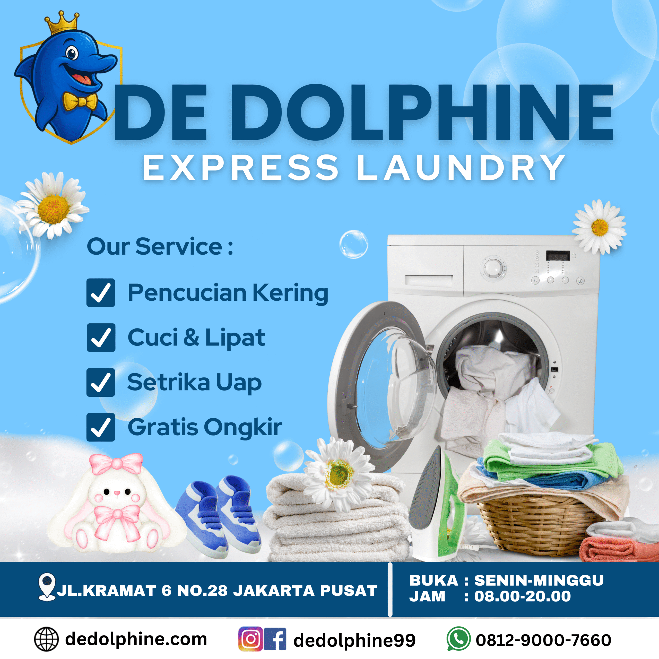Selamat datang di De Dolphine Express Laundry! Solusi terbaik untuk Anda yang ingin pakaian selalu wangi, rapi, dan siap pakai tanpa repot. Kami hadir dengan layanan unggulan: Pencucian Kering, Cuci & Lipat, Setrika Uap, hingga Gratis Ongkir. Dengan pelayanan cepat, profesional, dan harga bersahabat, kami siap membantu menjaga kenyamanan dan kerapihan pakaian Anda setiap hari. 🌸👕🧺